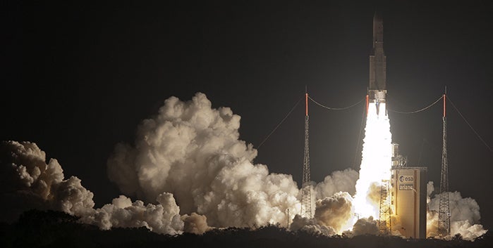 Image: Argentina’s first geostationary communications satellite ARSAT-1 launching from a base in French Guiana. Photo: courtesy of Arianespace.