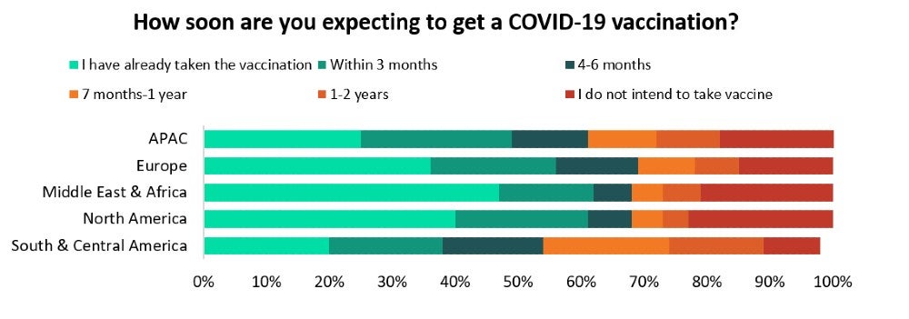 GlobalData’s live Verdict poll* found that 23% of respondents in North America did not intend to take a vaccine for Covid-19. This was the highest number of respondents in comparison to any other region. Although 40% have already been vaccinated, those refusing to do so will negatively impact outbound tourism recovery.
