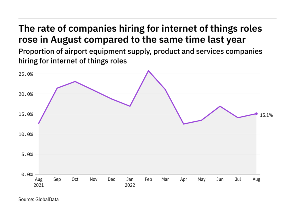 The proportion of airport equipment supply, product and services companies hiring for internet of things related positions rose in August…