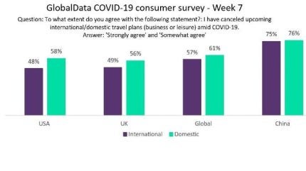 According to a recent GlobalData survey, on average 57% of global respondents agree that they have had to cancel international travel plans amid Covid-19. Meanwhile, 61% of respondents changed domestic travel plans. Flights and holidays have been cancelled as travel restrictions have brought global travel to a standstill. On average, 75% of Chinese travellers, the world’s largest source market, have cancelled international travel plans.