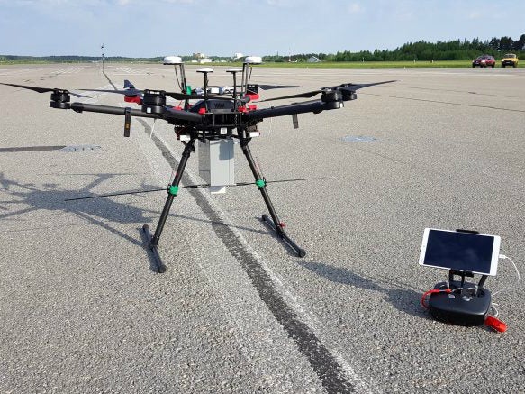 Drones are used to calibrate NAVAIDS to ensure pilots land safely, as well as runway equipment such as lights and ground surfaces. The company provides drones for ground and flight inspections, which offer cost and time savings compared to traditional flight inspection units.