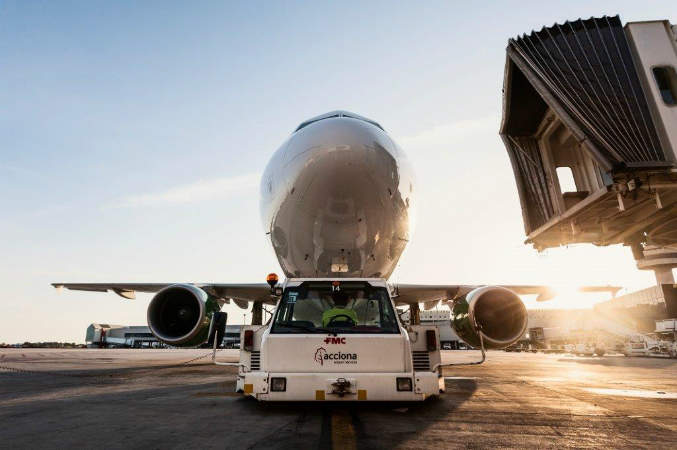 Acciona Airport Services assists with ground operations, including loading and unloading suitcases and freight, dragging and thrusting aircraft, drinking and wastewater services, and aircraft de-icing operations. It also cleans passenger and crew cabins, auxiliary equipment, tyres, electrical and air-conditioning units.