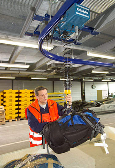 Demag’s DSM SpeedHoist is a fast and simple way of handling baggage items weighing up to 80kg. The system offers simple control via the rocker switch in the grip, high lifting speeds up to 70m/min for rapid handling and infinitely variable speed control. The SpeedHoist features optimum load guidance. Special hook designs are also available.