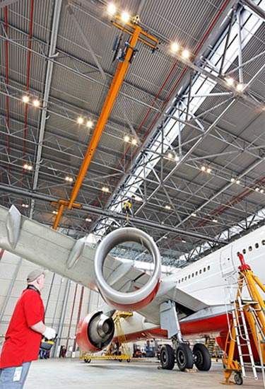 The installation and removal of aircraft components place high demands on crane systems. The torsionally rigid crane girder design used on Demag suspension cranes prevents any unwanted movement or load sway while parts are being transported or assembly work is carried out. Since the crane runways are fitted direct to the roof superstructure, there is no need for any support columns.