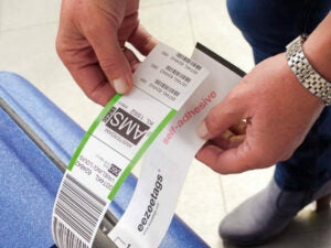 eezeetags are bag tags specially designed for self-service bag-drop operations. eezeetags have a magic adhesive that does not stick to bags, clothes, children or floors. The eezeetags need no pulling away from any backing paper, so they create no waste at the point of tagging, and can’t be tagged in the wrong way, because they simply do not stick.