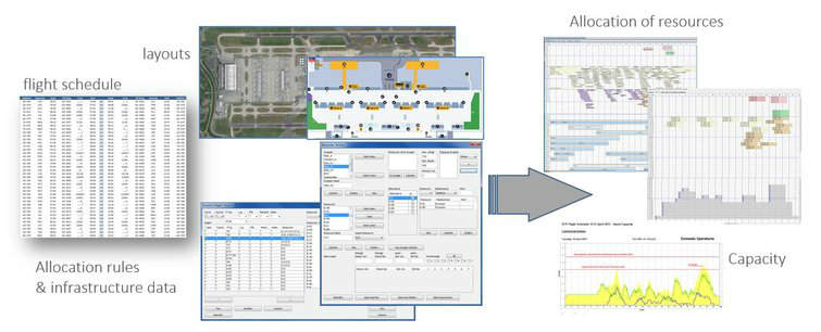 The software provides a graphical report of the exact number of check-in counters, gates, security and passport controls, and reclaim belts needed by airports. Resources for check-ins, gates and baggage areas can be allocated based on layouts and planning parameters, allocation rules and preferences.