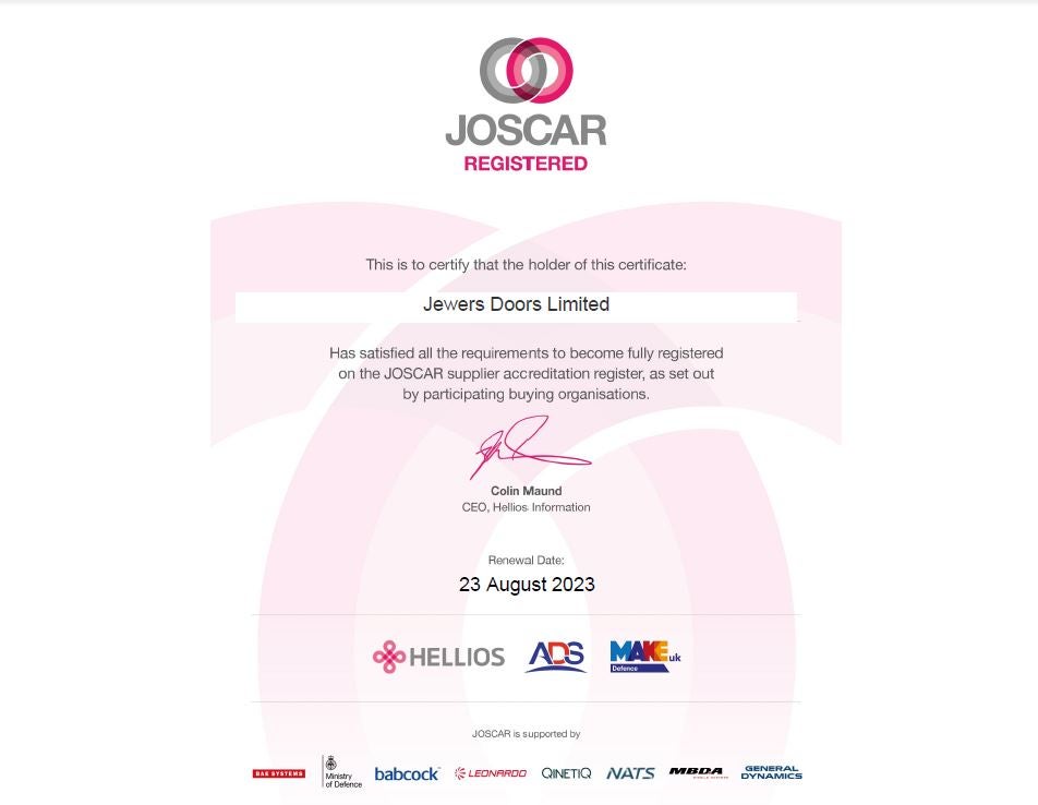 Jewers Doors is proud to announce it has been accepted on to the JOSCAR register and is now recognised as a fully compliant supplier to prime contractors and several major defence organisations.
