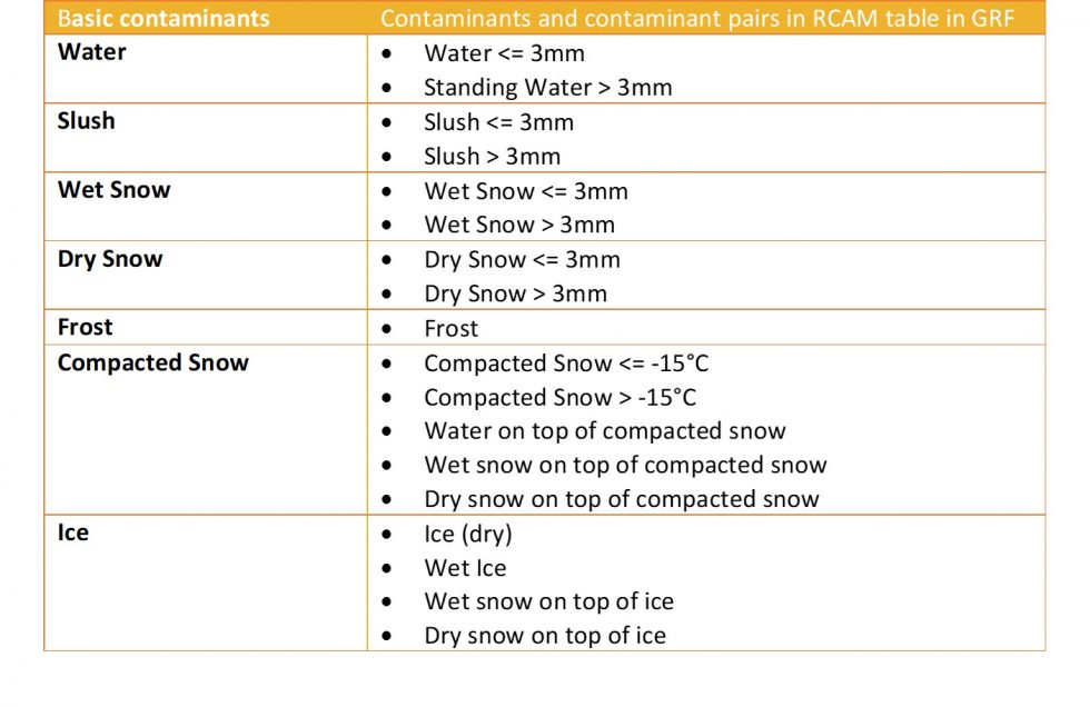 New contaminants or pairs of contaminants that have been defined in the runway condition assessment matrix (RCAM) table in GRF regulations, however, are built up from these basic contaminants, considering depth, temperature or a combination of these two on top of something else (for example, compacted snow or ice).