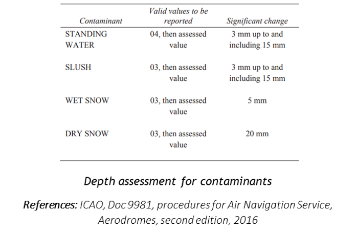 According to Runway Condition Assessment Matrix (RCAM), contaminant depth 3mm is the limit value for different runway condition code classes. When contaminant depth passes 3mm, it requires immediate reassessment. Contaminant depth below 3mm normally represents runway condition code five. Depth over 3mm reflects runway condition codes three or two depending on the contaminant type.