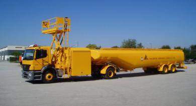 The semi-trailer RFS 60 aircraft refueller has 60,000l worth of tank volume, two deck hoses of 3,200l/min via aircraft couplings and two reel hoses of 3,000l/min via aircraft couplings. Defuelling is a maximum acceptable vacuum and the centrifugal pump is mechanically driven. The monitor is 3,406l/min and the meter is one counter 6in with a rate of flow indicator for refuelling and defuelling. The hose reel is two radial with 25m hose and 21/2in hydraulic rewind.