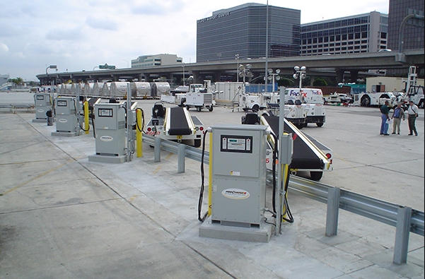 PosiCharge’s MVS400 and MVS800 solutions can charge up to 16 vehicles simultaneously while sharing an existing infrastructure. Examples of these vehicles include tow tugs, baggage tractors and belt loaders.