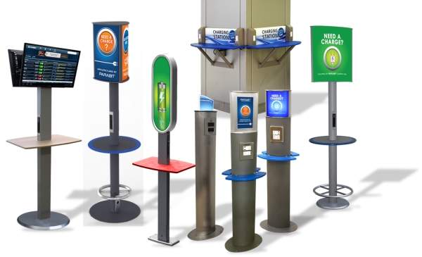 The company’s mobile device charging stations are made out of metal, offering durability and vandal resistance; perfect for public environment deployments. They cover a small footprint, and have often been placed side-by-side to serve as an electronics charging area.
