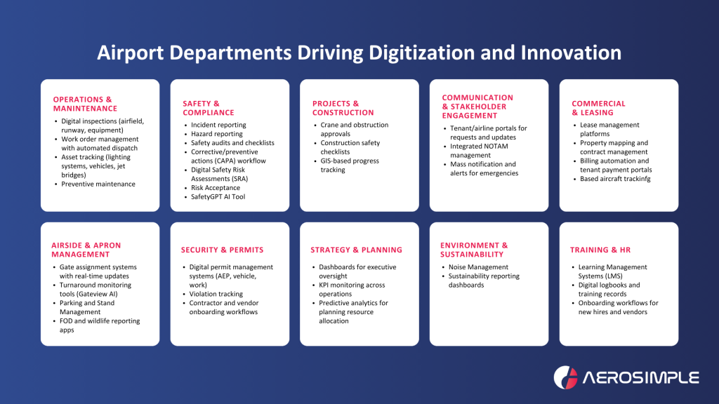 Evidence of enterprise performance anchors the case for expansion: a comprehensive Computerized Maintenance Management System (CMMS) / Enterprise Asset Management (EAM) implementation at a major international airport that digitized preventive maintenance and asset management at scale. This implementation indicates readiness for complex, high-volume environments. At the same time, Aerosimple expanded from an initial set of modules to a full aviation-specific suite exceeding 30 modules, spanning airfield operations, safety, compliance, sustainability, and asset and work management. The platform’s cloud-based architecture, built on the reliable foundation of Amazon Web Services (AWS), has been a key enabler of this stability and growth, ensuring consistent performance and scalability as deployments expand. Its modular design enables airports to adopt what they need today and expand over time without disruption, supporting tailored workflows, retention, and thoughtful upsell as needs evolve.