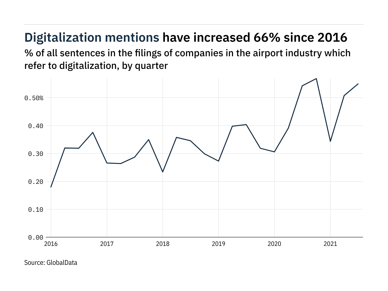 Mentions of digitalization within the filings of companies in the airport industry were 66% higher between October 2020 and September 2021 than in 2016, according to the latest analysis of data from GlobalData.