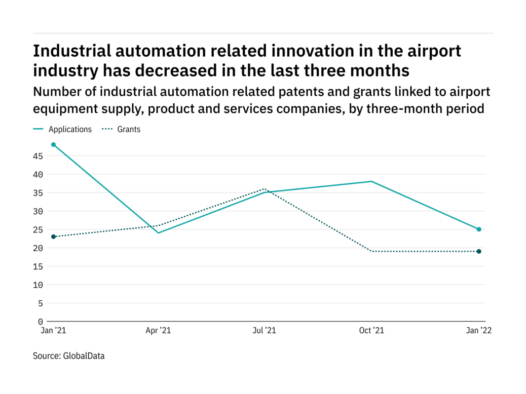The most recent figures show that the number of industrial automation-related patent applications in the industry stood at 25 in the three months ending January – down from 48 over the same period in 2021.