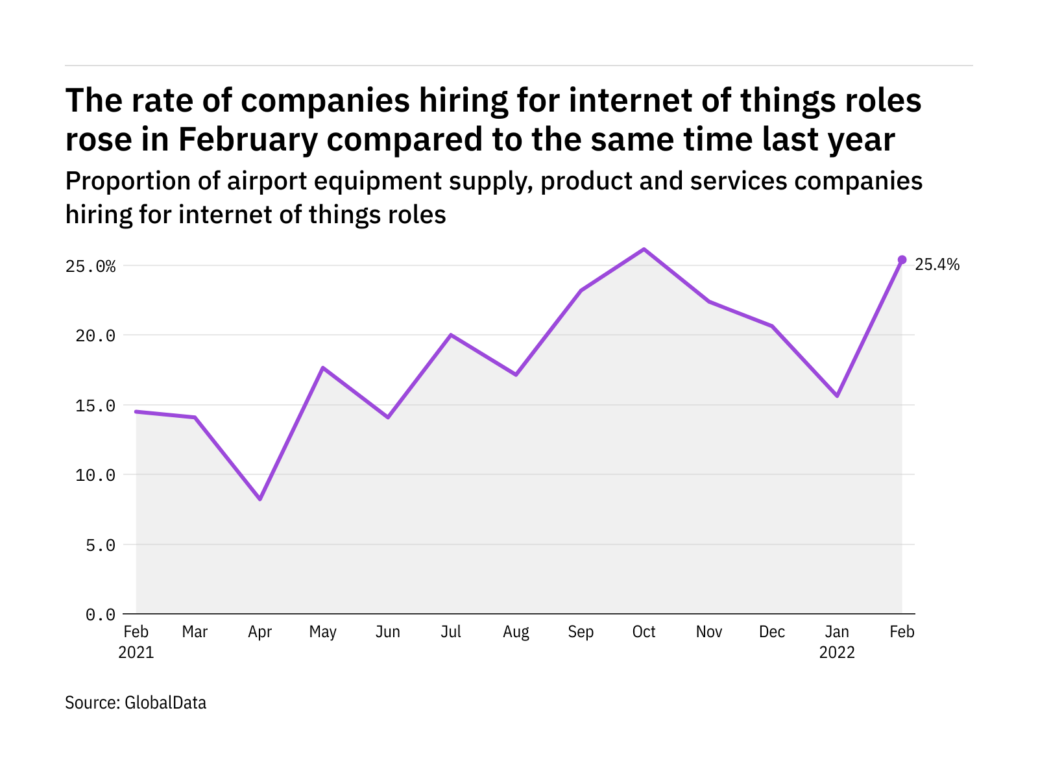 By GlobalDataOur analysis of the data shows that airport equipment supply, product and services companies are currently hiring for internet of things jobs at a rate higher than the average for all companies within GlobalData's job analytics database. The average among all companies stood at 1.1% in February 2022.