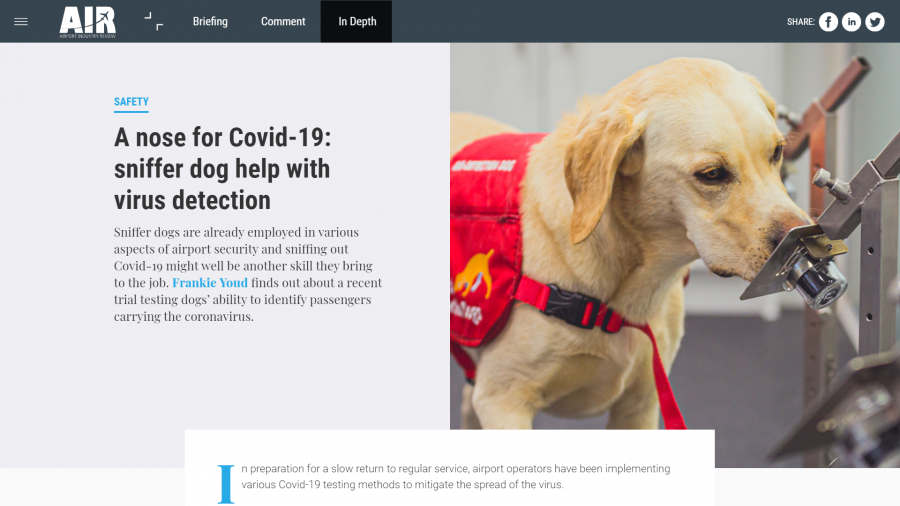 Sniffer dogs are already employed in various aspects of airport security and sniffing out Covid-19 might well be another skill they bring to the job. Frankie Youd finds out about a recent trial testing dogs’ ability to identify passengers carrying the coronavirus.