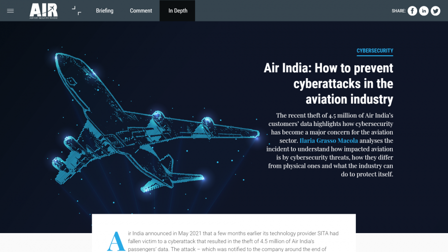 The recent theft of 4.5 million of Air India’s customers’ data highlights how cybersecurity has become a major concern for the aviation sector. Ilaria Grasso Macola analyses the incident to understand how impacted aviation is by cybersecurity threats, how they differ from physical ones and what the industry can do to protect itself.
