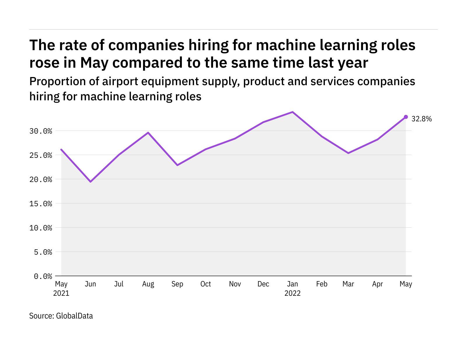 The proportion of airport equipment supply, product and services companies hiring for machine learning related positions rose in May 2022 compared with the equivalent month last year, with 32.8% of the companies included in our analysis recruiting for at least one such position.