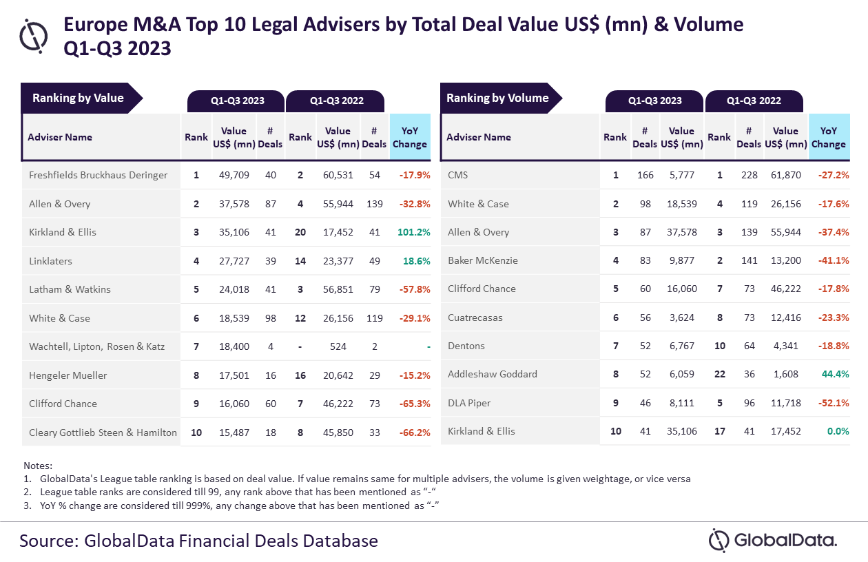 Freshfields Bruckhaus Deringer and CMS were the top M&A legal advisers in Europe in Q1-Q3 2023, according to GlobalData’s ranking of leading M&A advisers.