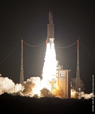 Image: Ariane 5 launching with ATV Georges Lemaître from the Spaceport’s ELA-3. Photo: courtesy of Arianespace.