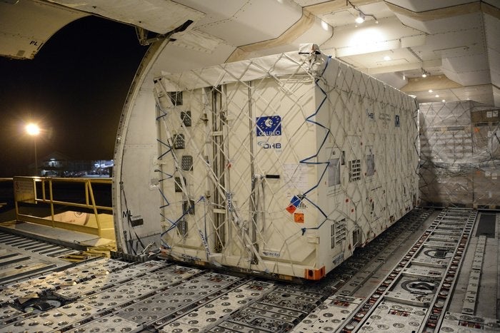 The satellites landed at Cayenne-Félix Eboué Airport on an Air France Boeing 747, and were transported to Europe’s Spaceport.