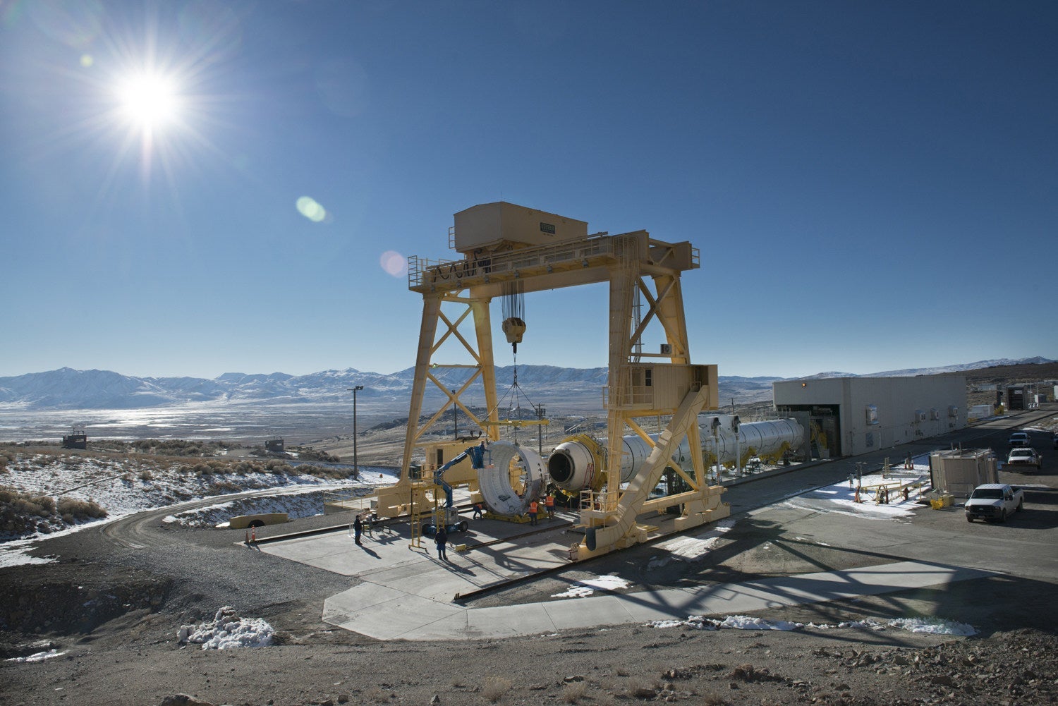 Image: The first qualification motor for Nasa’s Space Launch Systems booster at ATK’s test stand in Utah. Photo: courtesy of ATK / PRNewswire.