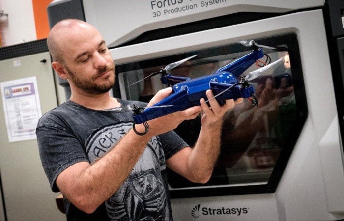 Image: Phillip Keane from Nanyang Technological University, Singapore examining his Stratasys 3D printed quadcopter. Photo: courtesy of Stratasys.