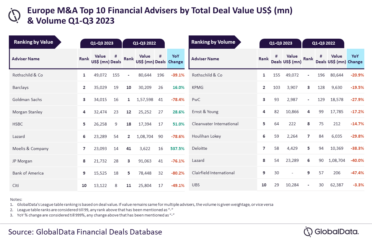 Rothschild & Co was the top M&A financial adviser in Europe in Q1-Q3 2023, according to GlobalData’s ranking of leading M&A advisers.