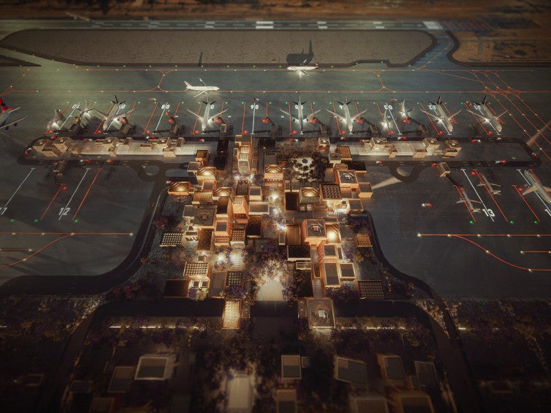 The modular terminal will consist of interconnected clusters of tall and tapered stone buildings of varying heights between the drop-off zone and the apron that will be paired with outdoor stone-paved pathways and courtyards. The modular design offers flexibility and facilitates future expansion as demand increases.