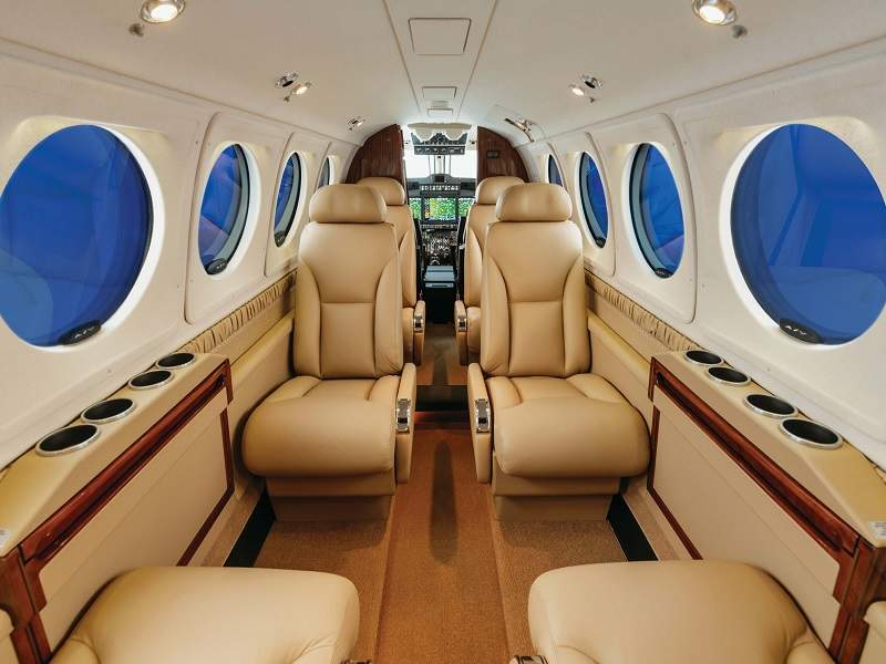 The King Air 250 features a square-oval-shaped spacious cabin, which includes a refreshment room, automated electronic window shades, and standard electrical devices. The electronic window shades can be adjusted automatically to create an ambience that suits the mood of the passengers.