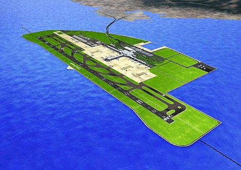 The new airport was constructed on an artificial offshore island created by a land-reclamation scheme started in 2001 and completed by spring of 2003. The land was reclaimed by building concrete revetments on the seabed and then building the island up with hundreds of tons of rock and sandstone landfill. The seabed was particularly shallow and stable in this region, allowing this to be achieved.