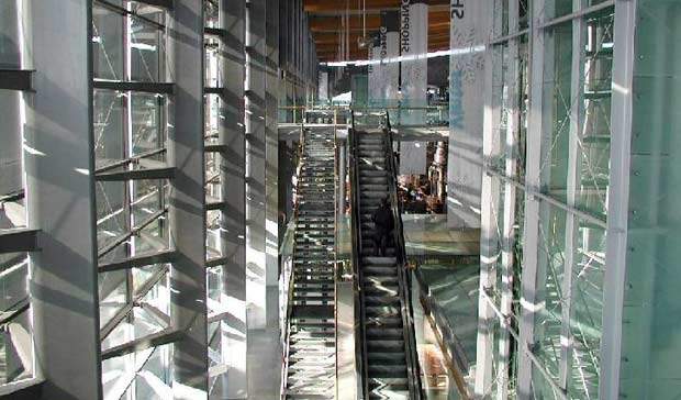 Passengers embark and disembark along a series of galleries made entirely out of glass. The building’s large transparent surfaces allow people in the building to be aware of their position with respect to the outside.