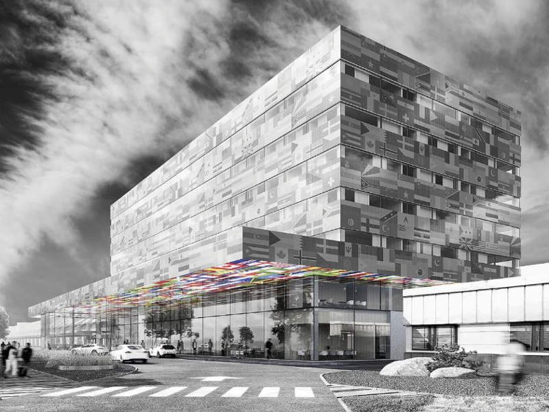 Discreet, abstract flags of the world’s countries will be included as part of the new hotel facade. The international theme is enabled by the cantilevered roof of the building.