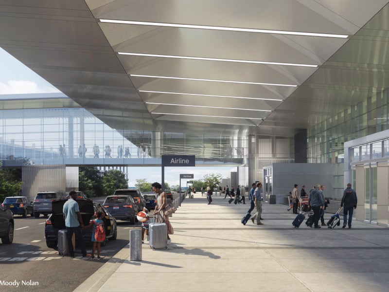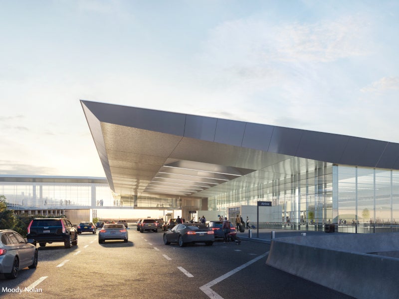 The terminal’s exterior is designed for streamlined access to various modes of ground transportation, including transit, rental cars, and parking.