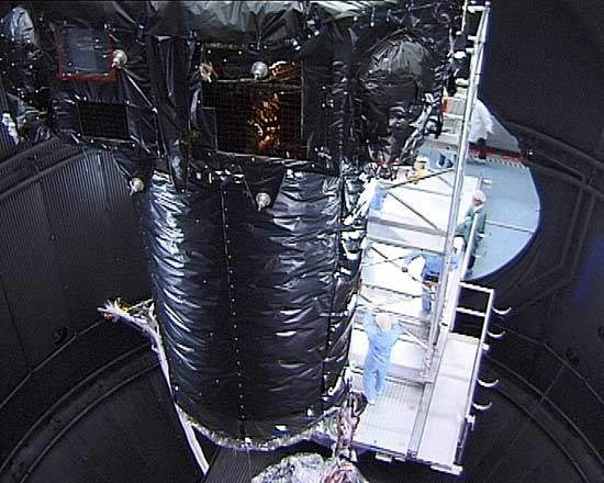 The 98m tall (321ft) service gantry is moved in on rails from its parked position to cover Ariane 4 for the final pre-launch preparations. Protected by the large gantry, the launcher receives its satellite payload, which is hoisted from the ground by an overhead crane.