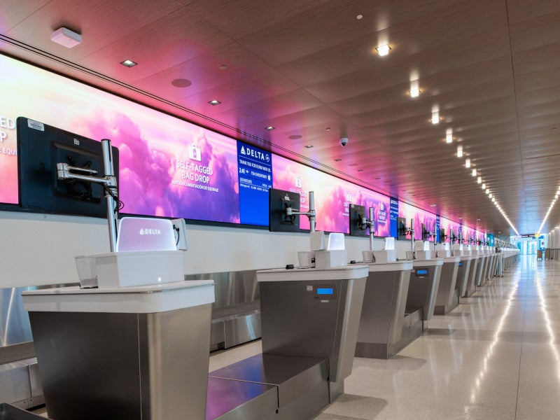 The Transportation Security Administration (TSA) checkpoints at the terminal are installed with digital signage that displays passenger wait times and enables the dynamic adjustment of queuing zones based on passenger traffic.