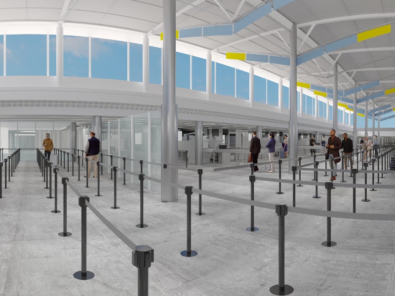 The central terminal area will have an elevated roof for allowing more natural light into the ticketing hall, increased circulation space, and queuing depth. The security checkpoint at concourses E and F will be expanded and new concession areas will be added.