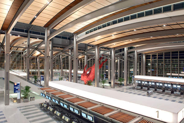 The terminal is designed to showcase the regional culture and history of Sacramento and geographical features of California’s Central Valley. The airport invested about $8m in public artworks at the terminal. At the centre of the facility is a 56ft suspended aluminium red hare, called ‘Leap’, designed by artist Lawrence Argent. Other works include tile mosaics, sculptures, Christian Moeller’s intricate woodwork panel and interactive flat screens.