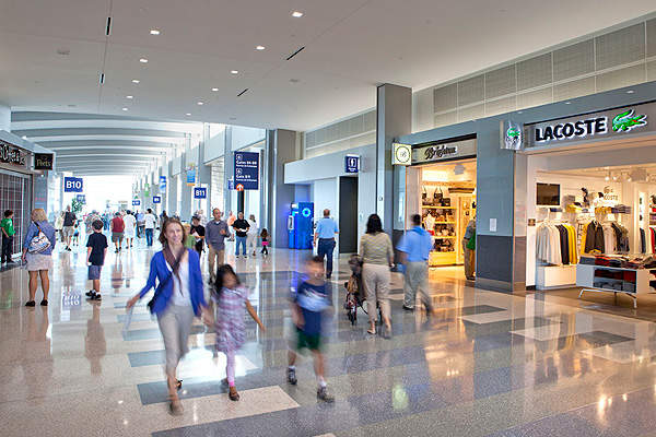 The terminal has 250 flight information display system (FIDS) with 32′-57′ Samsung monitors, 20 self check-in ticketing kiosks, free wireless internet access and four baggage claim rotundas.