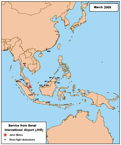 The strategic importance of Senai International Airport has to be understood in terms of Malaysia's geography and its proximity to Singapore, Thailand and Brunei Darussalam, Vietnam, Myanmar and Cambodia. This region has potential for tourism and commerce, with a four-hour flight radius reaching out to Hong Kong, Macau, Guandong, North Australia, India, the Philippines, Indonesia and Indochina.