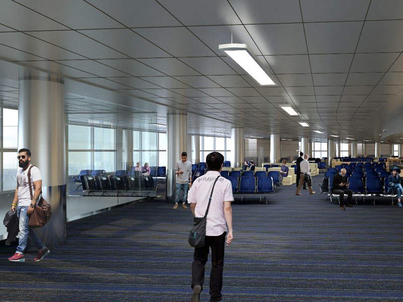 The passenger hold room in the second floor has been expanded to provide more seating and five new food and beverage facilities were added in the departure lounge. Two new gates with passenger loading bridges were also added.