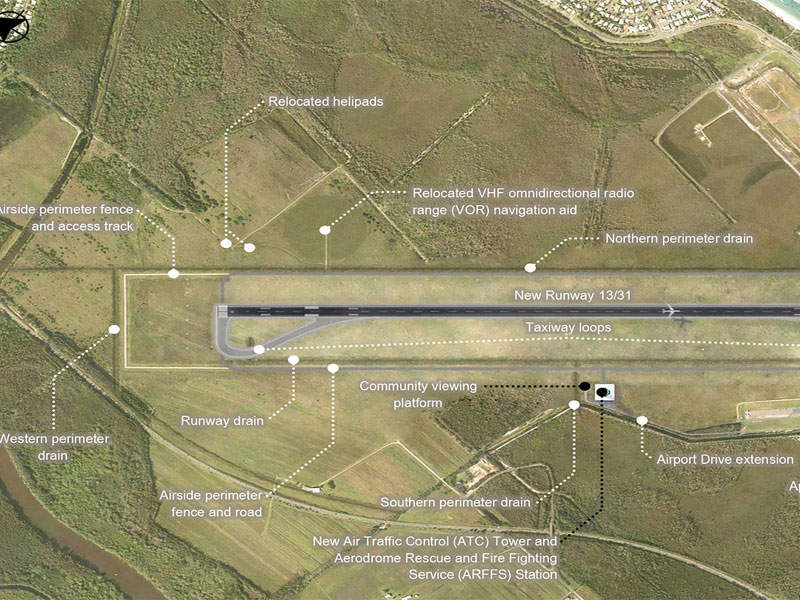 The new runway, designated 13/31, will be 2,450m-long and 45m-wide and will be aligned in south-east/north-west direction. It will intersect the existing runway slightly at the north. It will be able to handle larger aircraft such as Airbus A330 and Boeing 777 and 787 and will be complaint with all CASA and international standards. To be operational by 2020, the runway will be served by the existing terminal.