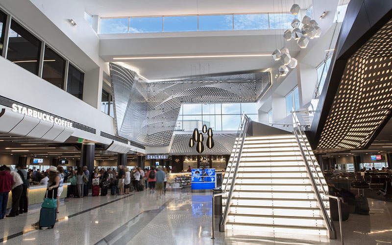 After crossing the TSA checkpoint, the travellers enter the commercial hub, which is a duty-free retail area that connects to a terrace with dining options, textured surfaces and lounge-style seating.