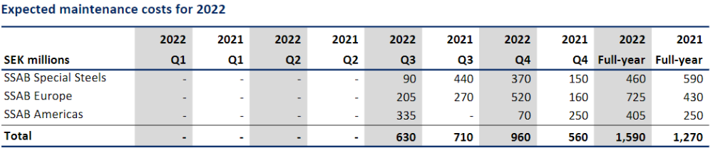 Maintenance costs for 2022 for SSAB Group are expected to rise to SEK 1,590 million, higher than the previous forecast of SEK 1,210 million, as Raahe’s blast furnace maintenance has been moved up to November 2022, as previously stated. The overall increase in prices for goods and services across the world is another factor for the higher costs.