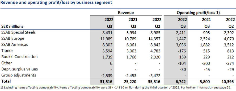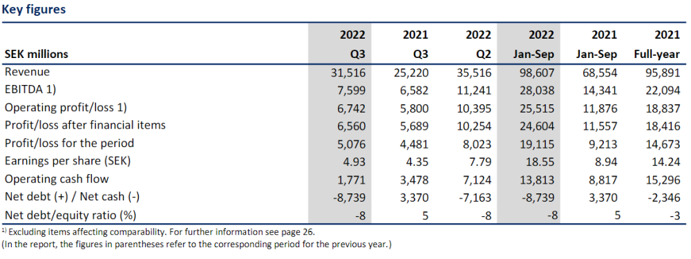Revenue for Q3, 2022 was SEK 31,516 million (SEK 25,220 million – Q3, 2021), up 25% compared to the third quarter of 2021, off the back of higher global steel prices; revenue was down 11% against Q2, 2022.