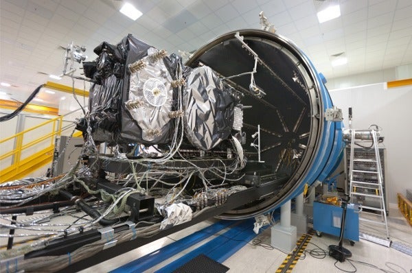 Image: The fourth Galileo satellite during thermal vacuum testing at Thales Alenia Space Italy’s facility in Rome. Photo: courtesy of ESA/EADS Astrium – R Kieffer.