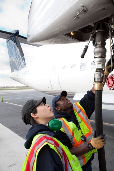 Image: A Bombardier Q400 turboprop aircraft being loaded with a 50/50 blend of biofuel and Jet A1 fuel prior to its flight. Photo: Bombardier.
