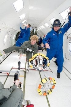 Image: CU-Boulder students trialled the behaviour of DANDE satellite parts in a modified Nasa jet that creates microgravity conditions. Photo: courtesy of University of Colorado Boulder.