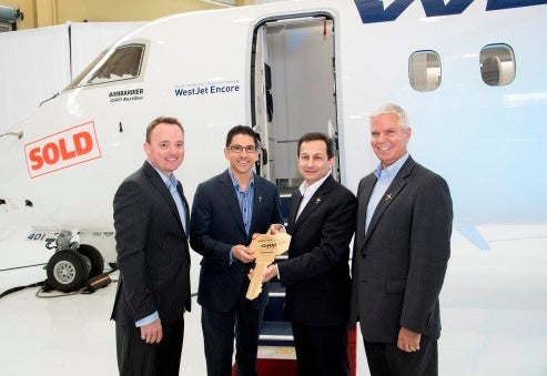 Image: Officials of Bombardier and WestJet during the delivery of WestJet’s first Bombardier Q400 NextGen aircraft. Photo: courtesy of Bombardier.